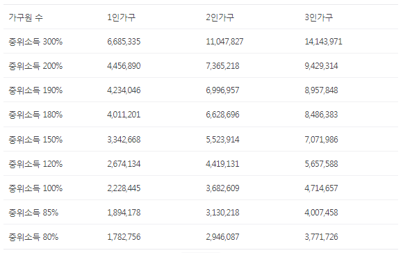 소득 : 건강보험료 본인부담금 기준 중위소득 150% 이하