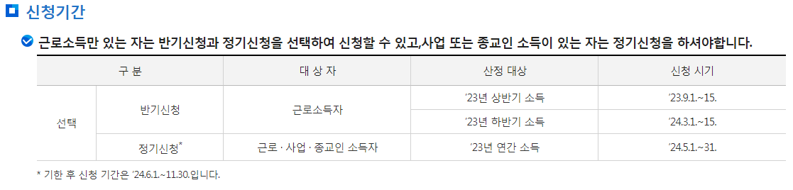 반기신청도 가능하지만 사업소득자와 종교인 소득자는 정기신청에만 신청이 가능합니다.
