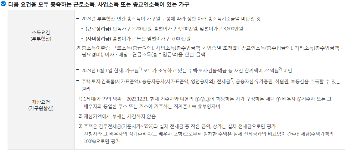 재산요건 : 2023년 6월 1일 현재 가구원 모두가 소유하고 있는 주택·토지·건물·예금 등 재산 합계액이 2.4억원 미만